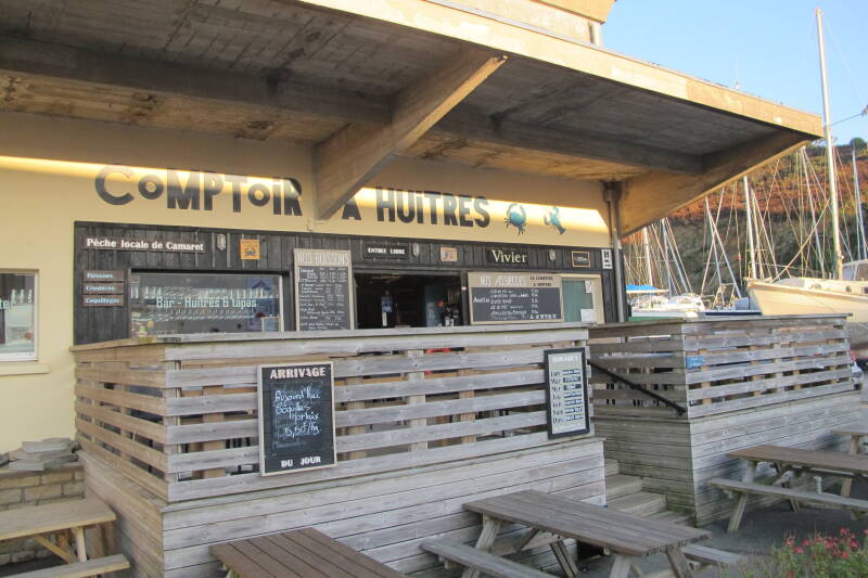"Une adresse qu'on hésite à conseiller car on veut la garder un peu secrète. Le Comptoir, c'est encore l'âme de Camaret qui rappelle les anciennes activités de pêche. Situé au bout du quai, dans l'ancienne criée, au milieu des bateaux en hivernage, il garde pour ses clients les derniers rayons du soleil, pile poil à l'heure de l'apéro, avec (ou sans) l'assiette d'huîtres locales ou de fruits de mer. On aime l'accueil de Laëtitia, la déco maison faite avec du bois et des objets récupérés sur d'anciens langoustiers désarmés, les viviers et la vente de poissons du jour."